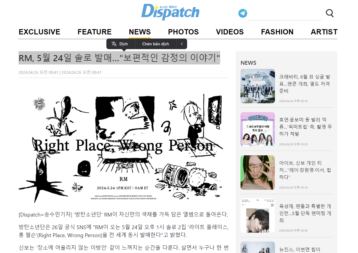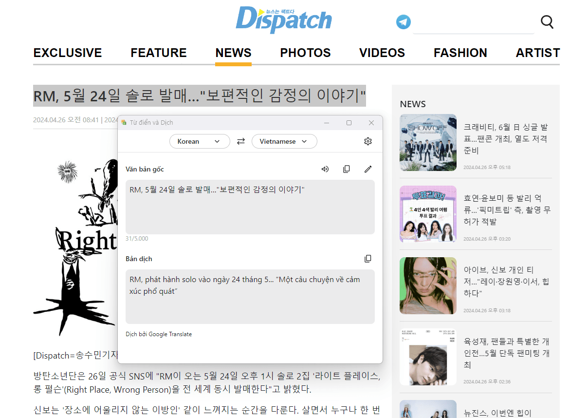 Tập đọc báo vừa có thể giúp bạn biết những tin tức thú vị ở Kbiz vừa có thể giúp bạn học thêm từ mới, cách dùng từ. Một số trang báo Hàn mà bạn không nên bỏ qua là Dispatch, Yonhap News (연합뉴스), Korea Economy TV (한국경제TV),… Tuy nhiên, việc truy cập qua lại các trang web để tra cứu từ ngữ và dịch nghĩa khiến cho việc học từ mới qua báo chí trở nên bất tiện. Hiểu được điều này, Cốc Cốc giới thiệu đến bạn tính năng Tra từ điển. Chỉ cần bôi đen từ hoặc đoạn văn bản, Cốc Cốc sẽ cung cấp bản dịch tức thì.