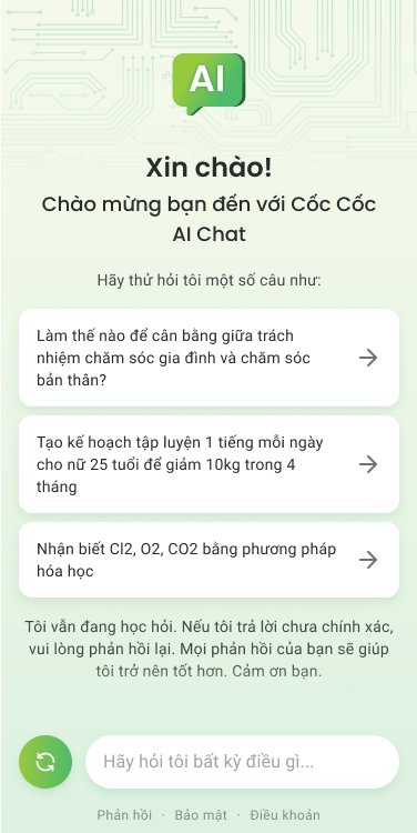 Bạn hỏi càng rõ ràng, Cốc Cốc AI Chat đáp càng đúng ý. Cách hỏi của bạn càng sáng tạo thì bạn càng khai phá được nhiều tiềm năng của Cốc Cốc AI Chat. Từ học tập, công việc cho đến cuộc sống, dù là lĩnh vực nào thì Cốc Cốc AI Chat cũng có thể hỗ trợ bạn.