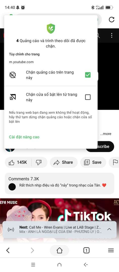 Đồng thời, tính năng Chặn quảng cáo đã được kích hoạt sẵn trên Cốc Cốc. Dù bạn xem video hay nghe nhạc YouTube tắt màn hình, Cốc Cốc sẽ tự động lọc bỏ những banner quảng cáo chiếm diện tích màn hình và cả những video chen ngang. Vì vậy, bạn sẽ có trải nghiệm nghe nhạc YouTube không quảng cáo làm phiền, không lo đứt mạch cảm xúc.